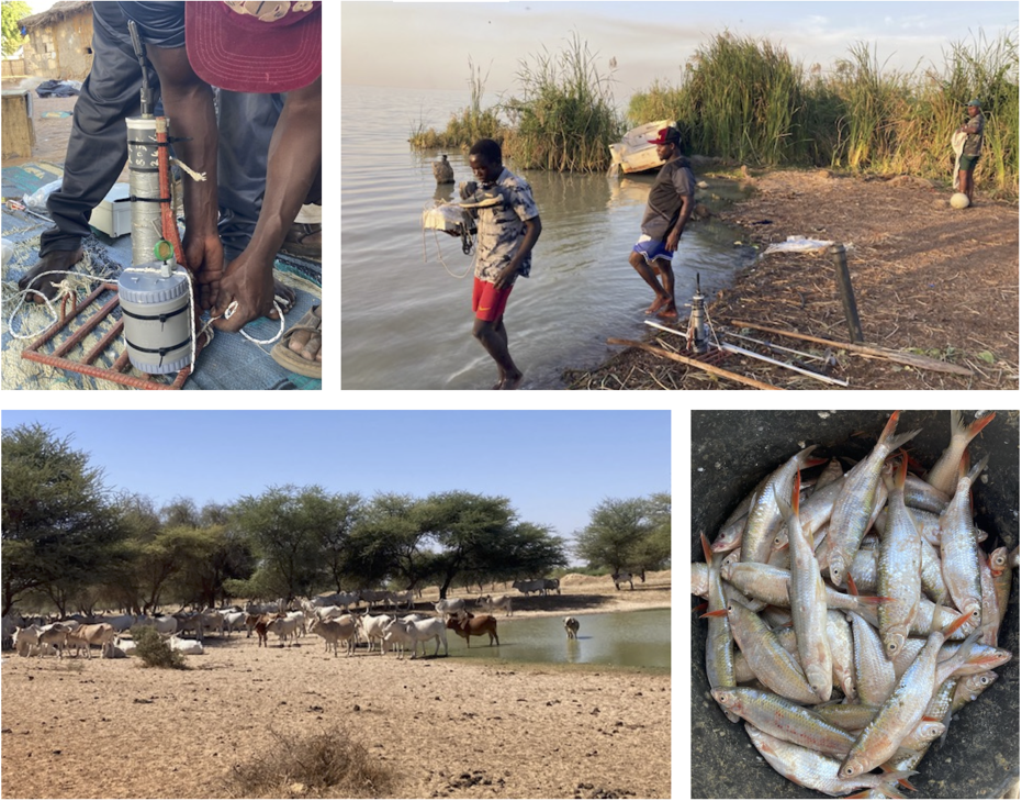 Durant cette mission deux enregistreurs conçus au Cofab in Dakar de UMMISCO Sénégal ont été déployés, pour la première fois, dans le cadre du projet de recherche participative Santés et Territoires. Il s’agit d’un hydrophone, provisoirement baptisé « Hydrophone Made in Sénégal » (en haut à gauche), et d’une sonde multi-paramètres de qualité de l’eau (en haut à droite). Les observations collectées lors d’une immersion de 25h des deux sondes dans le Lac ont été partagées avec le living lab de Mbane. Les acteurs ont manifesté leur enthousiasme à renouveler l’expérience et à participer à la mise au point d’un protocole de suivi régulier ainsi qu’à l’interprétation des données. Celles-ci pourront nourrir les réflexions du living lab dans la recherche de solutions pour les problématiques halieutiques et environnementales auxquelles ils sont confrontés.